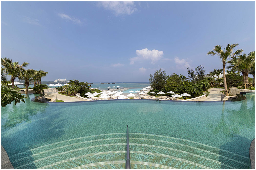 沖縄本島屈指のビーチリゾートである恩納村の美しい海に囲まれた瀬良垣島と、沖縄本島が一本の橋で繋がりひとつのリゾートを構成する、ユニークなロケーションを特長としたリゾートホテルです。グスクプール、ラグーン、海面とそれぞれに段差を設けており、プールが海にまで続くような、インフィニティな光景を演出しています。グスクプールのタイル「シーズン」は海の浅瀬の色に合わせ、明るく淡いトーンの青緑色のタイルを基調としつつ、アクセントに濃い色を使用。落ち着いた印象となりました。
