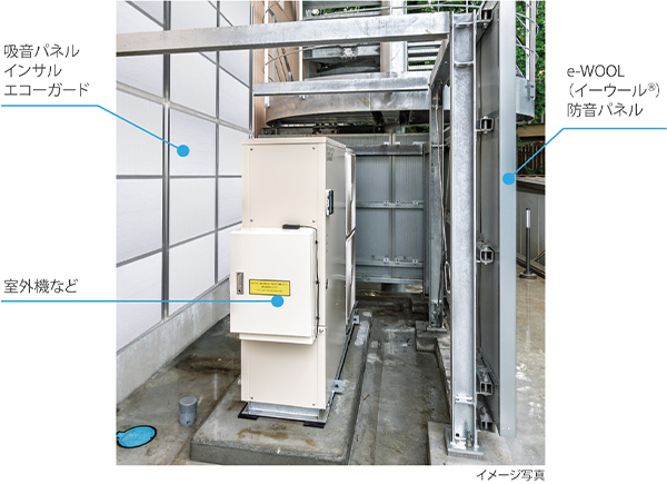 この度発売した当製品は、残響音の増幅を抑える吸音性能にすぐれた「e-WOOL(イーウール)」や「グラスウール」の2種類の吸音材を使用し、屋内・屋外を問わず幅広い用途に対応可能です。中でも、弊社独自の吸音材「e-WOOL」は、雨や日差しに強いすぐれた耐候性や、すばやく水を排出する透水性により、素材の劣化を防ぎ長期にわたり吸音性能を維持することが可能です。また、材質のポリエステル繊維は、リサイクルポリエステルを70%使用した環境配慮型素材です。