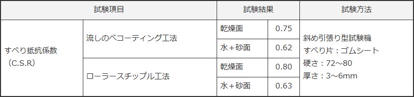 流しのべコーティング工法 | 乾燥面 | 0.75 | 斜め引張り型試験機 すべり片:ゴムシート 硬さ:72~80 厚さ:3~6mm |
