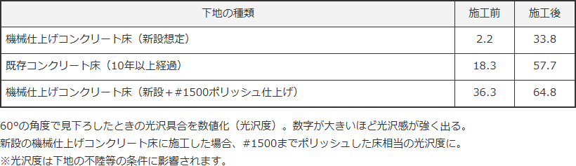新設の機械仕上げコンクリート床に施工した場合、#1500までポリッシュした床相当の光沢度に。