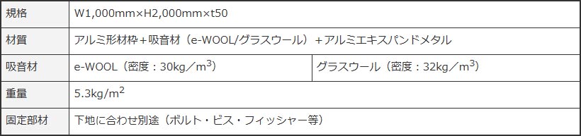 材質 | アルミ形材枠+吸音材(e-WOOL/グラスウール)+アルミエキスパンドメタル | |