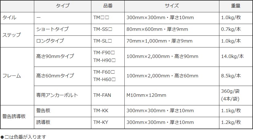| タイル | ー | TM□□ | 300mm×300mm・厚さ10mm | 1.0kg/枚 |