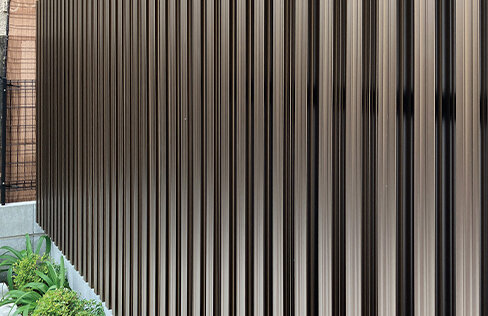 エービーシー商会の「 VertiLine(バーティライン)」は、固定金具間3,830mm以下であれば、上下固定のみで安全性を確保。中間支持材が不要なため、ルーバー裏面が気になるバルコニー・エントランスなどにおすすめです。