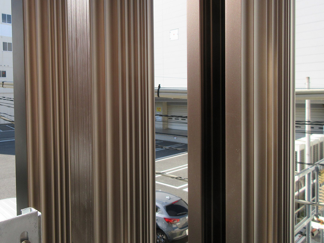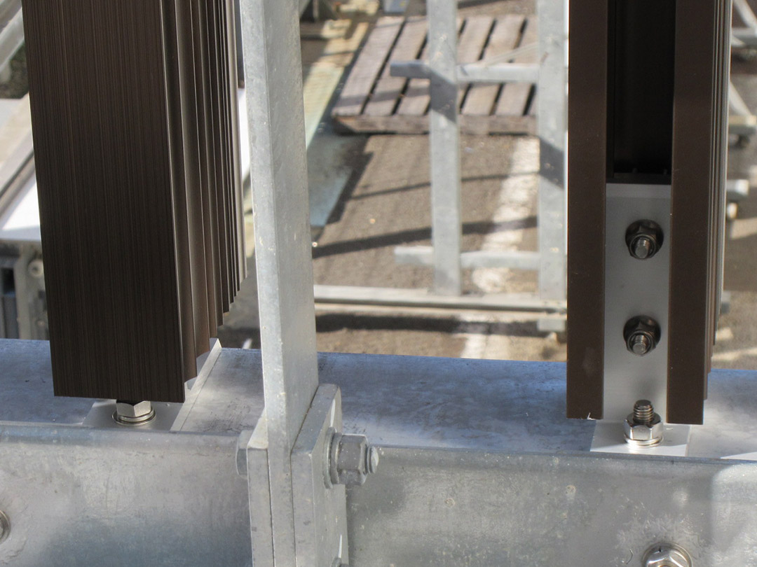 通常、外装ルーバーを施工する際は、設計強度を確保するために、ルーバー裏面に中間支持材を配した3点固定となります。そのため、バルコニーなどに施工する場合、裏面には中間支持材や金具が露出してしまい、意匠面が課題となっておりました。