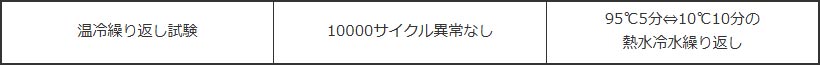 | 温冷繰り返し試験 | 10000サイクル異常なし | 95℃5分⇔10℃10分の 熱水冷水繰り返し |
